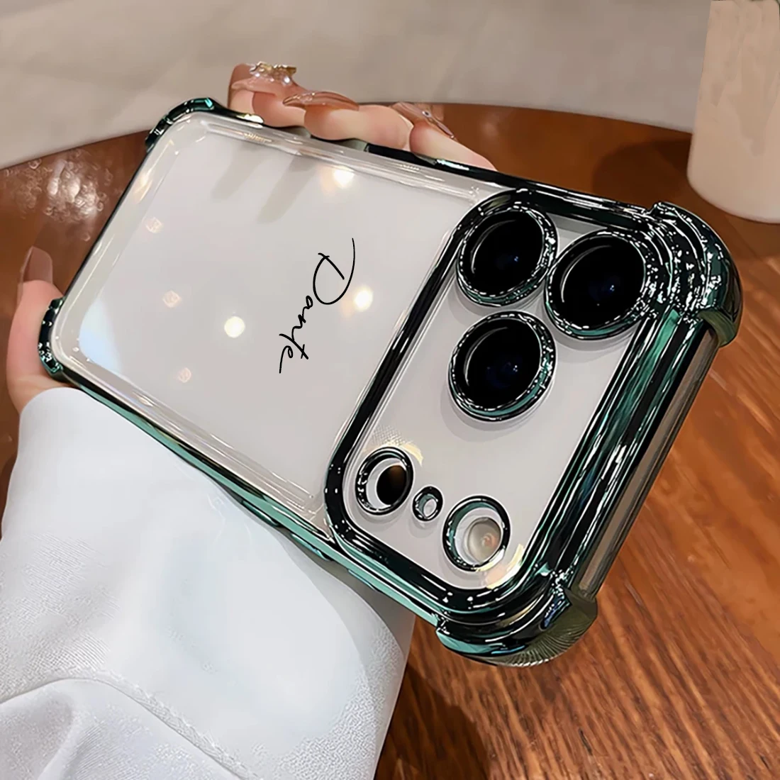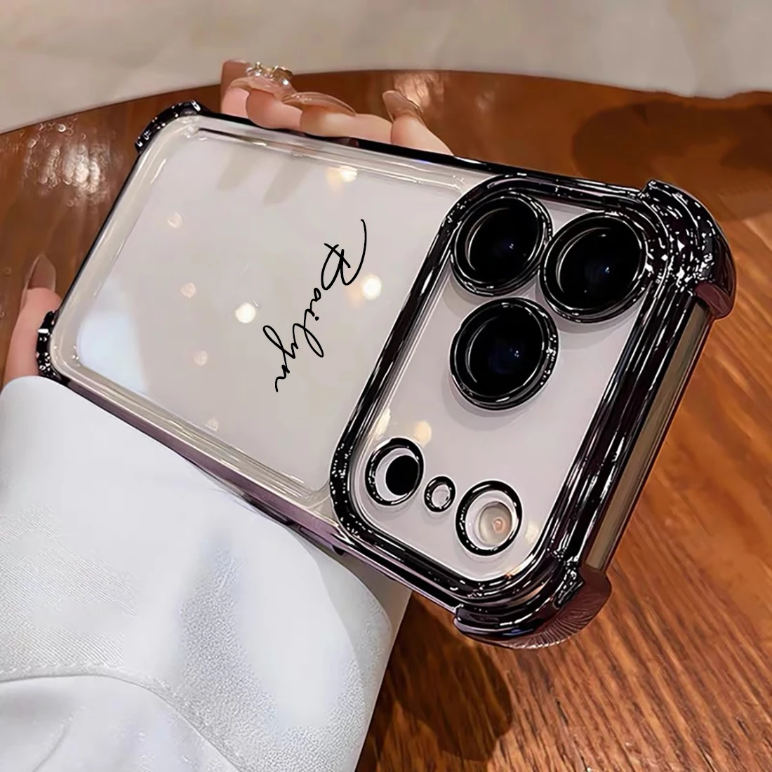 Dê um toque de estilo ao seu iPhone sem esconder o design original. A Capa Transparente Personalizada com Nome combina elegância, modernidade e proteção, com bordas metalizadas sofisticadas e estrutura antichoque para o uso diário.